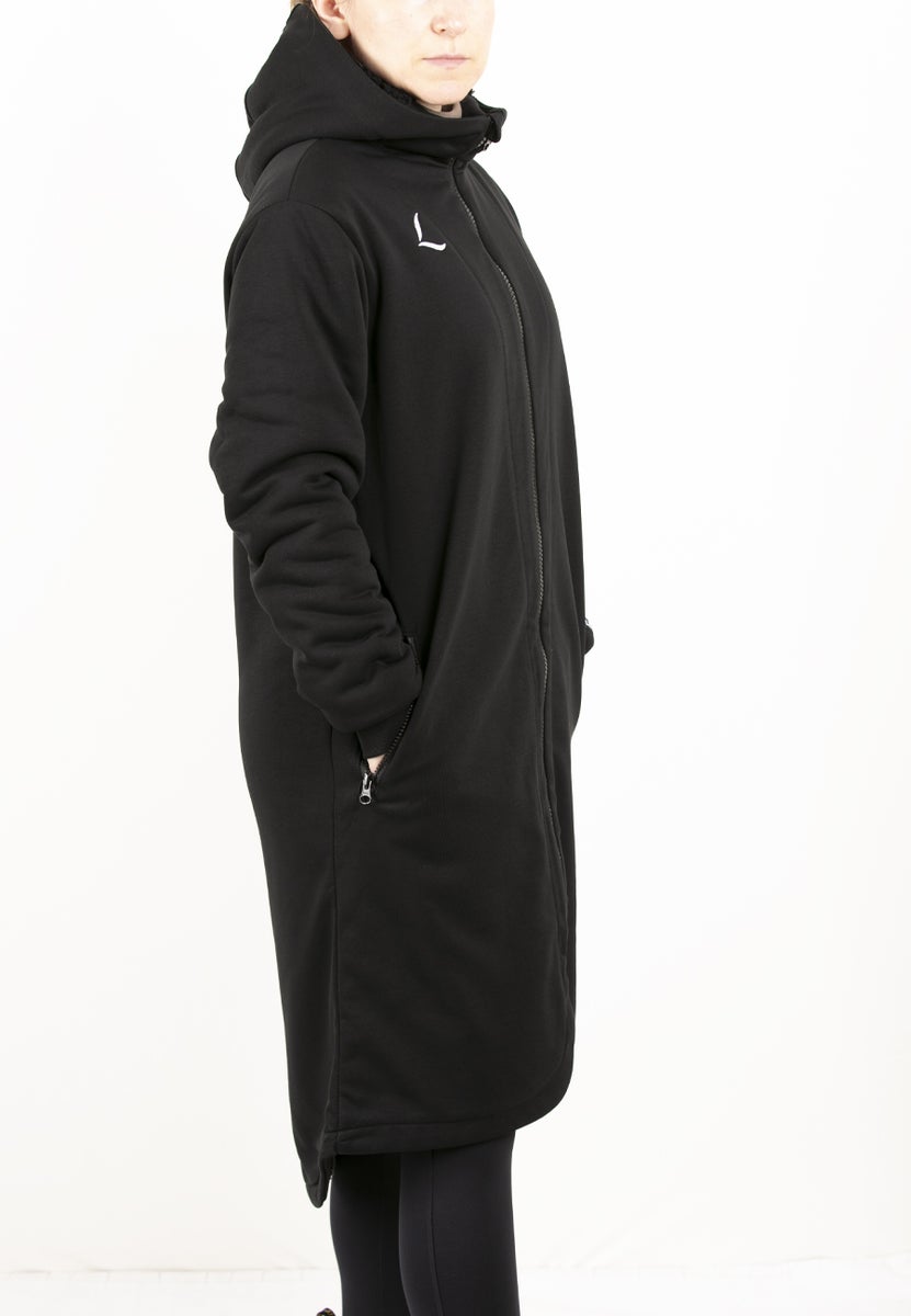 Pitkä ja väljä malli laskeutuu kauniisti ja suojaa reisiä kylmältä. Huppu kiristysnyöreillä tuo ripauksen urbaania tyyliä ja lisää käytännöllisyyttä tuulisina päivinä. Korkea kaulus pitää viiman poissa ja vetoketjun yläosa suojattu, joten kylmä vetoketju ei kosketa ihoa. Etupuolen kaksi vetoketjullista taskua pitävät puhelimen, avaimet ja kädet turvassa sekä lämpimänä.